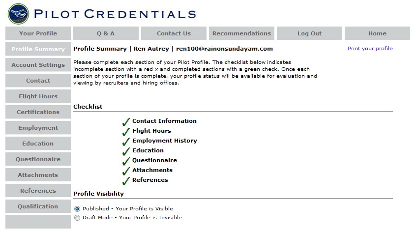 A: You create and maintain your own Pilot Profile that is stored in our database. Your profile includes flight hours, certifications, education, and other information relating to your professional experience. Your profile data is automatically matched against the minimum qualifications of listed air carriers. You can easily find air carriers matching your qualifications and contact their recruiter. Recruiters, in turn, can easily find your profile and match you to their qualifications. In addition, affiliate hiring offices use your profile information in their hiring process. This eliminates the need for you to fill out multiple job applications for various air carriers.